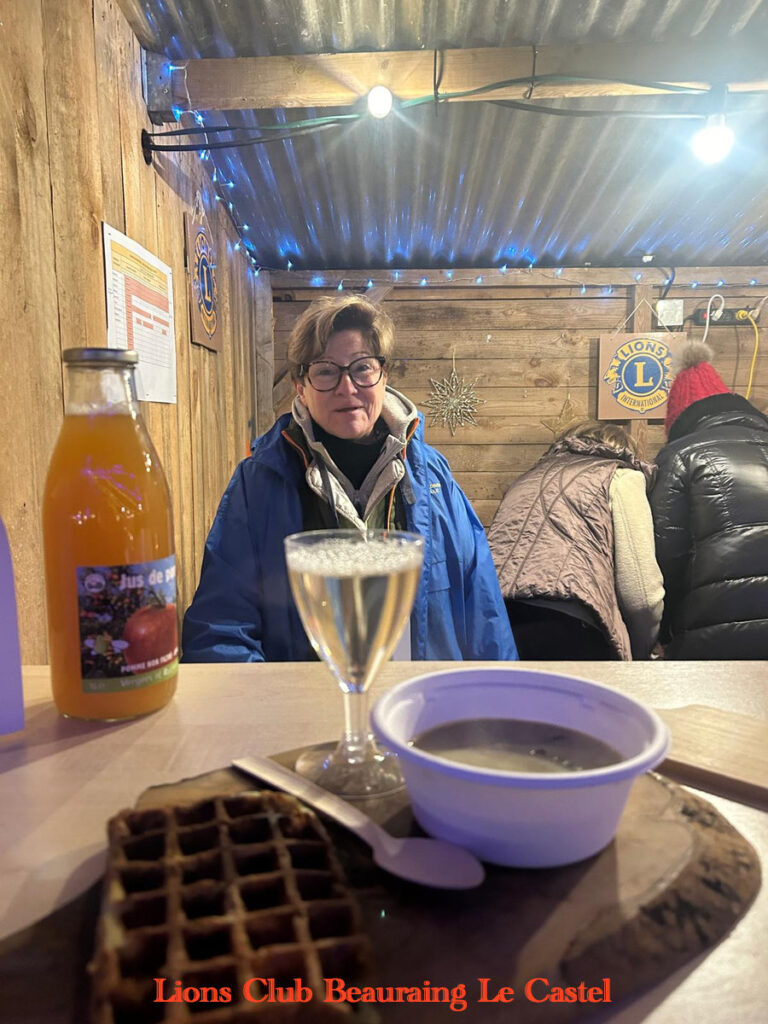 Le soir tombe et le Marché de Noël ouvre enfin ses portes. En l’occurrence – et d’autant qu’il n’y a là-bas point de porte – je devrais plutôt écrire que chaque personne qui s’y rend ferme soigneusement la porte de sa maison afin de ne pas laisser s’en échapper la chaleur, la tête couverte d’un bonnet et les pieds chaussés de bottines fourrées. Il règne un froid glacial ce vendredi soir et il tombe quelques flocons. Heureusement, l’ambiance festive du Marché nous réchauffe bien vite, aidée par la dégustation d’un potage fumant et de nos délicieuses galettes – lesquels rencontrent un franc succès – du vin chaud qui coule à flot – ou presque, n’exagérons rien ! – et de tous les autres produits qu’on trouve sur place – produits de bouche, décorations et idées de cadeaux de Noël…